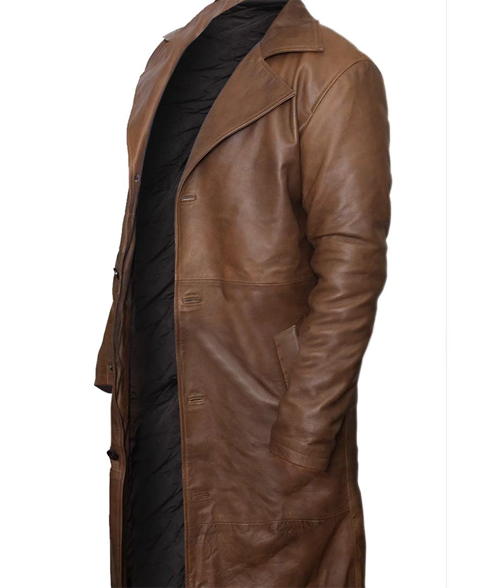 The material which is used in this coat is pure real leather which is very soft and authentic. The lining of this coat has polyester soft on the inner side of this batman trend coat. It is available in the distressed brown which is very alluring. In front, there is a button shutting. Two pockets are present at the waist side and one is present at the inner side of the coat. It has a lapel collar style which is amazing. The stitching method of this coat is very fine and tidy which gives it a very tricksy look. It has open hem cuffs at the end of both sleeves. Overall this coat gives us a decent and a charming look.