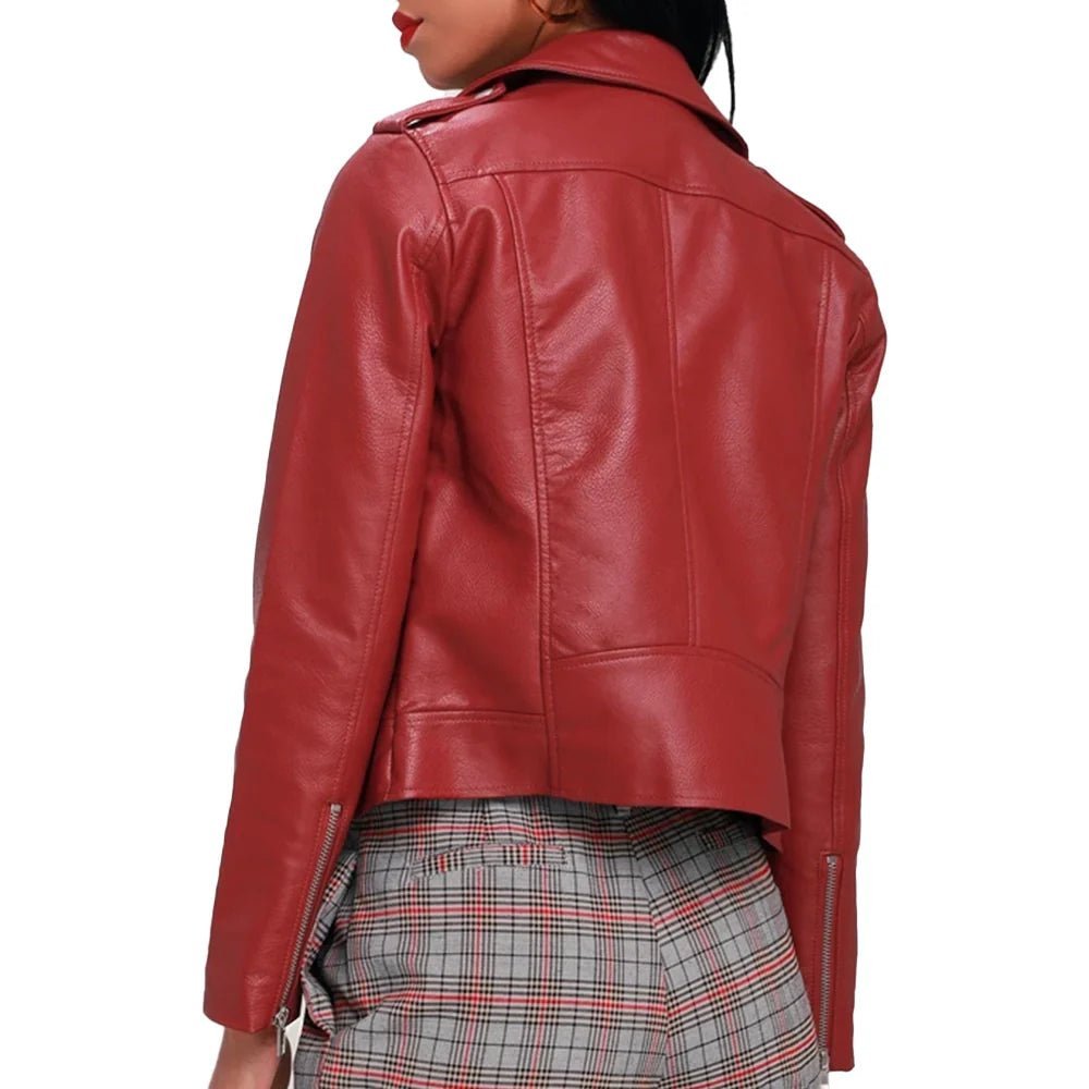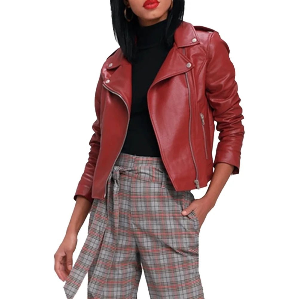 This biker womens red leather jacket will turn heads with its bold red color and classic biker style. It’s made from premium leather which is both comfortable and looks amazing. The jacket features a cool, asymmetrical zipper closure that adds a touch of edge. Inside, a soft lining keeps you cozy. This red leather biker jacket womens is a surefire way to add instant attitude to any outfit.
